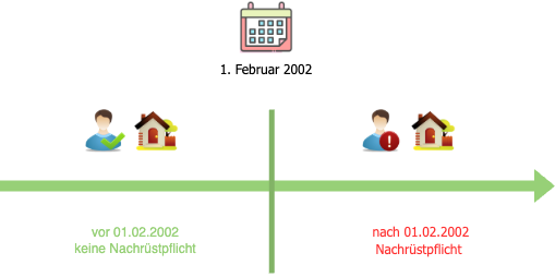 Ausnahme: Eigentümer:innen, die ihr Haus vor dem 1. Februar 2002 erworben haben und selbst darin wohnen, genießen einen sogenannten Bestandsschutz. Erst bei einem Eigentümerwechsel nach diesem Datum müssen die neuen Eigentümer:innen die gesetzlichen Vorgaben umsetzen – und zwar innerhalb von zwei Jahren.