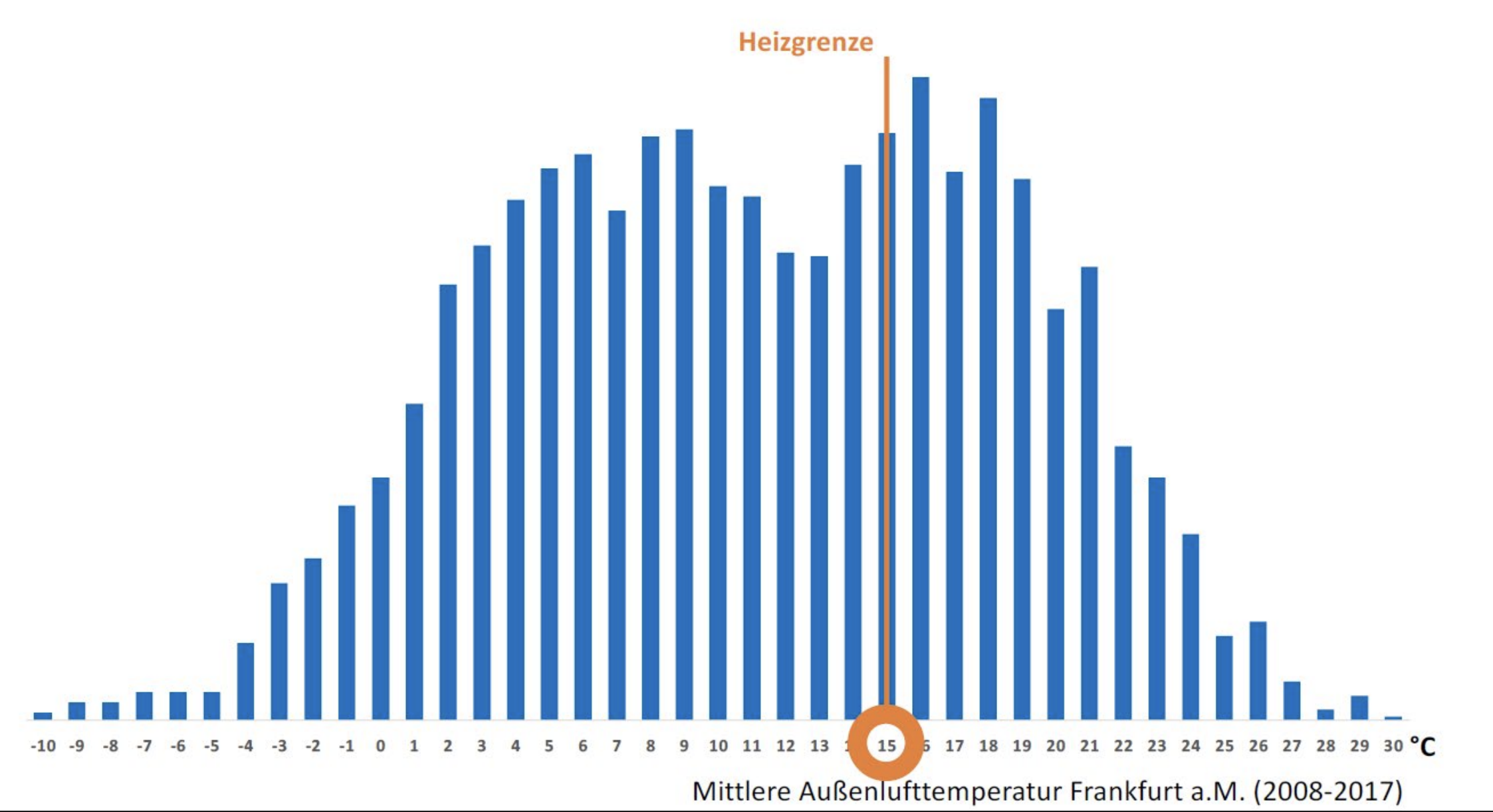 Eine statistische Auswertung der Außentemperaturen in Frankfurt am Main zeigt, dass die meisten Tage des Jahres eine Außentemperatur zwischen -10 und +30 Grad Celsius haben. Die Heizgrenztemperatur, also die Temperatur, bei der man beginnt zu heizen, liegt bei etwa 15 Grad Celsius. Das bedeutet, dass alle Temperaturen darüber uns nicht interessieren, wenn es um die Auslegung der Heizung geht.